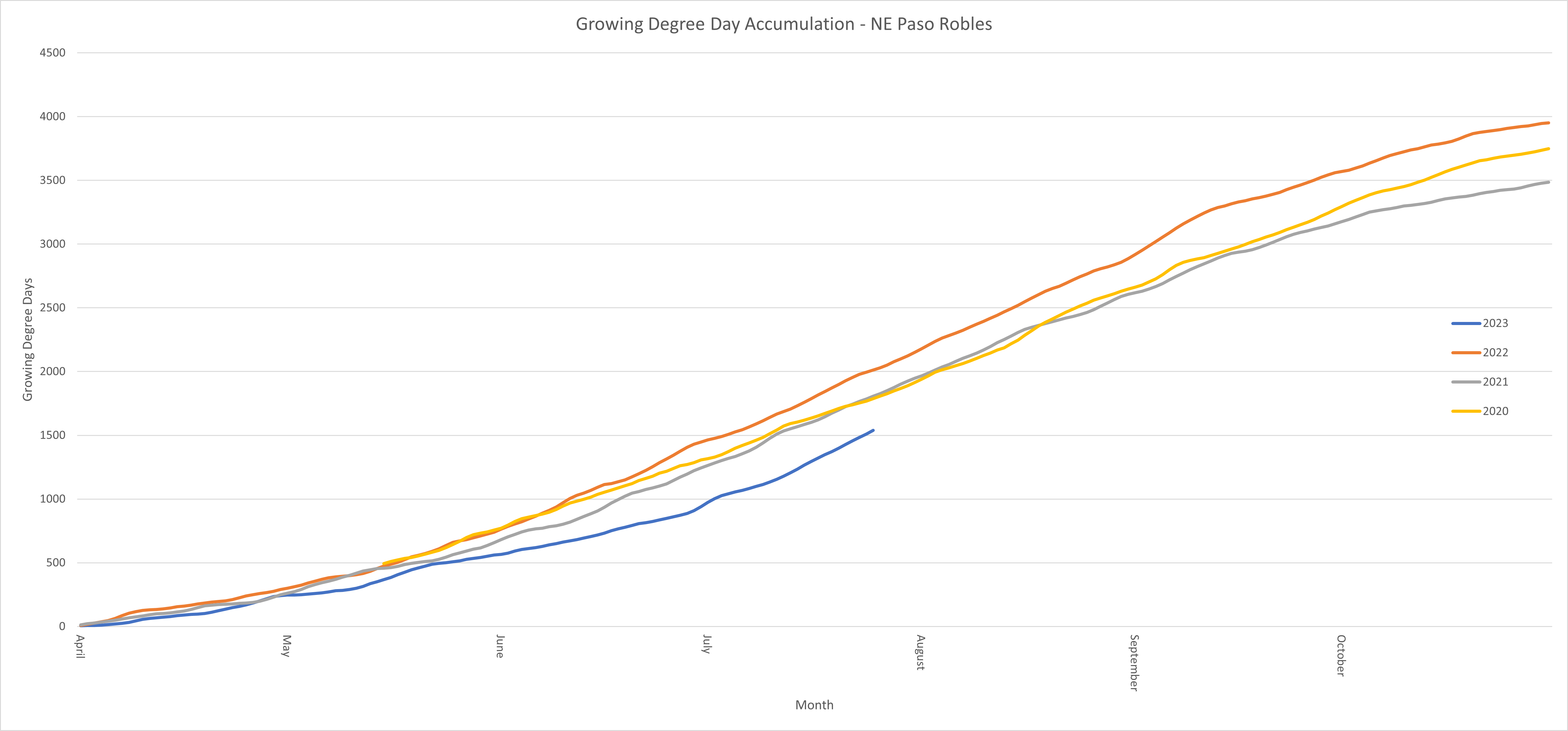 What about in other parts of the state? Here’s a comparison of the last few years in Paso Robles. Granted we don’t have as much data here, but 2023 is still looking behind everything in recent history. As of today this season clocks in at 1540 GDD, while the average for the three previous years is 1870 (Data from Western Weather Group).