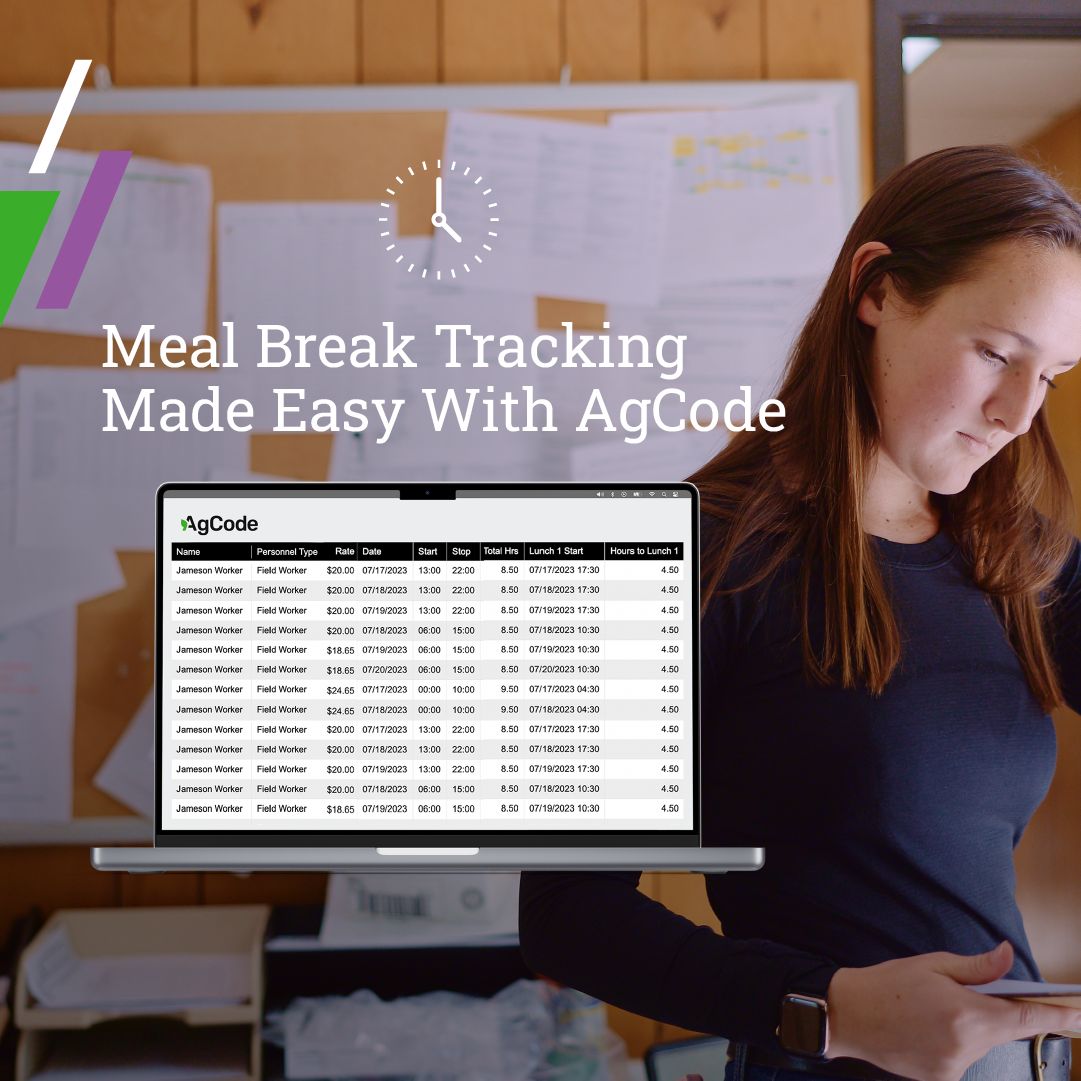 Introducing AgCode's Meal Break Audit Dashboard!Say goodbye to meal break audit worries with our latest powerful and seamless solution. Boost compliance and support employee welfare effortlessly with AgCode’s Meal Break Audit Dashboard. Request a demo today!