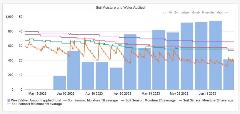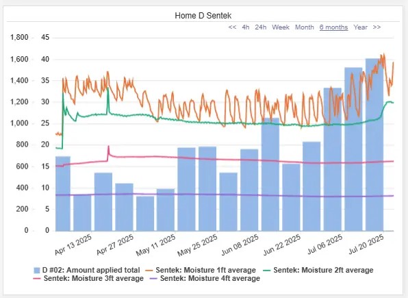 Soil moisture data showed a clear response at the 12” and 24” depths, confirming that the additional water was reaching the active root zone. This approach ensured the trees had access to adequate moisture during a high-demand period, while still maintaining efficient water use earlier in the season.