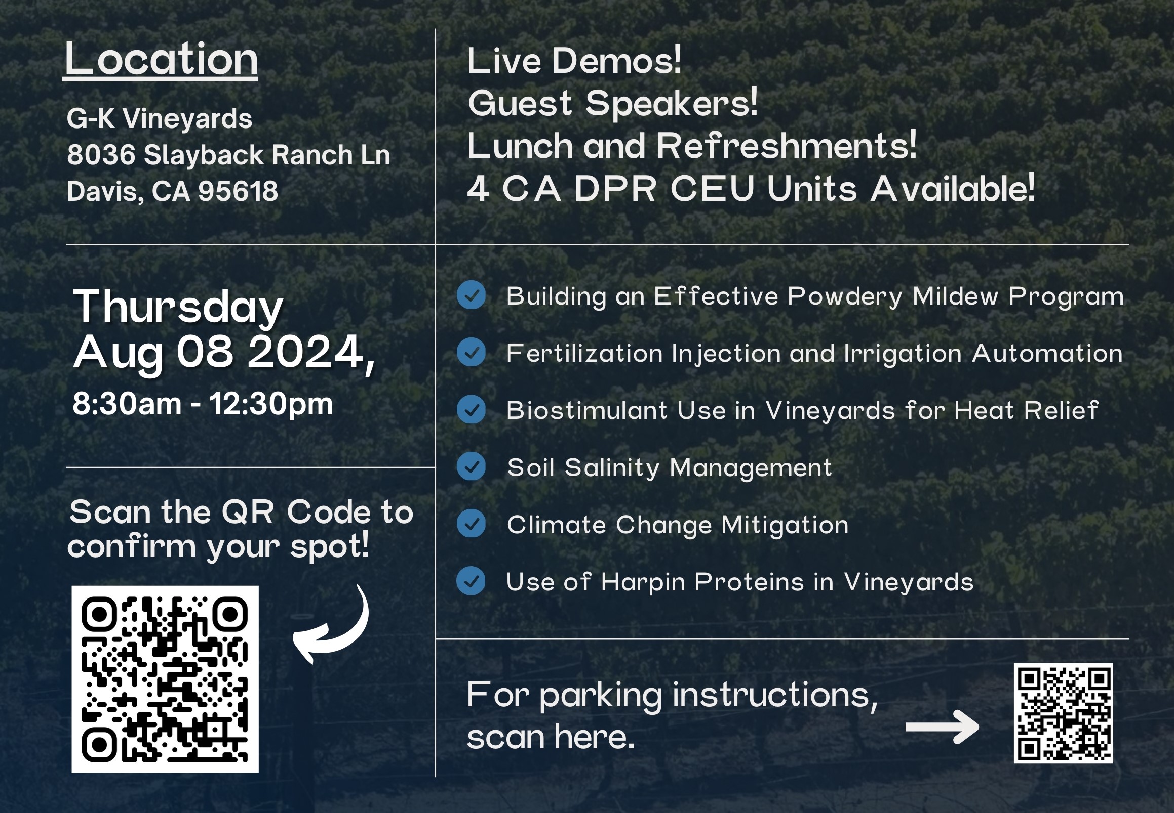 Kurtural Consulting brings you a Grape Day filled with valuable insights and live demonstrations on how you can increase sustainability for your vineyard! Join HotSpot AG, one of many speakers, as we tackle various topics including how irrigation automation can be combined with fertilizer injection to unlock vineyard efficiency like never before! Additionally enjoy lunch, refreshments, and earn 4 CA DPR CEU Units!