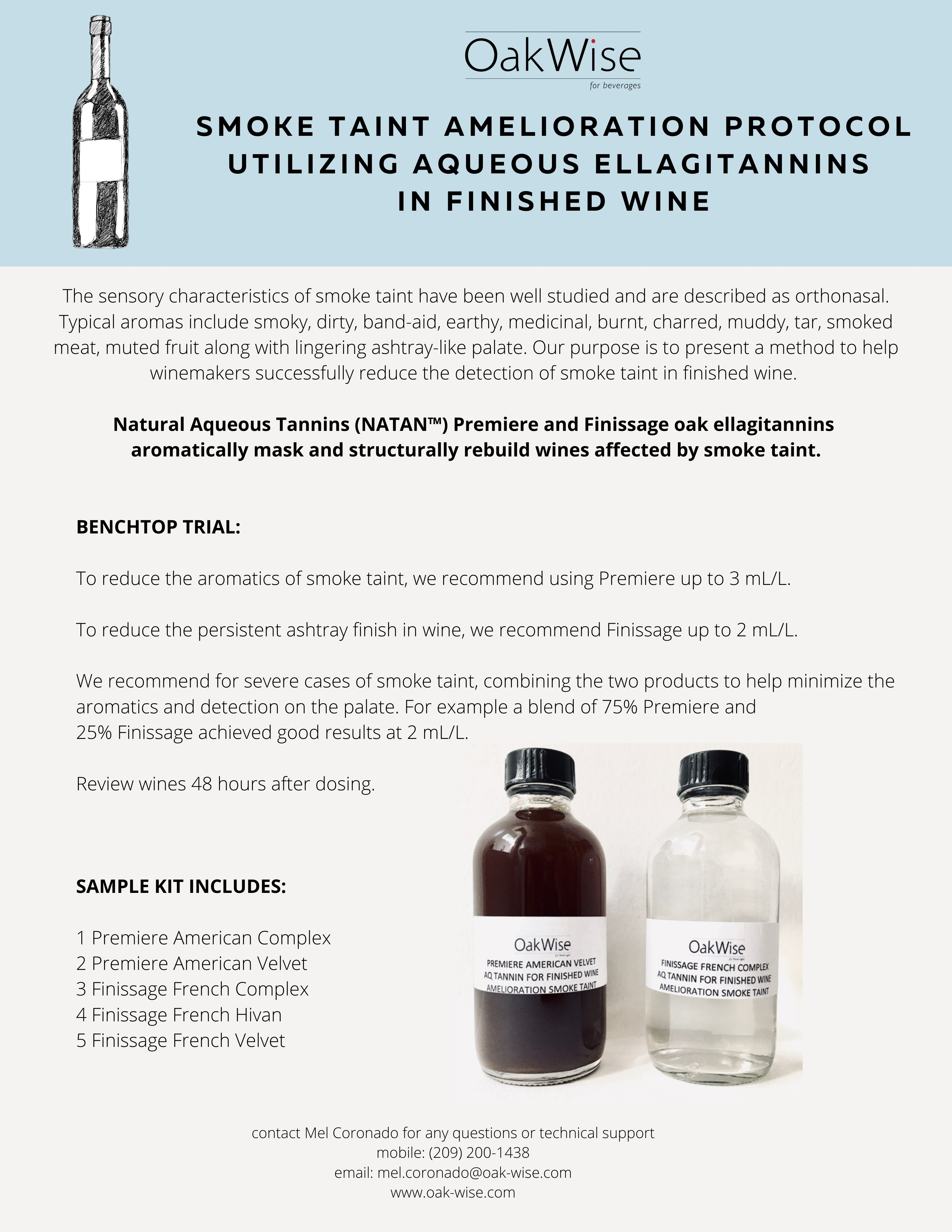 Oak Wise conducted a study on the effect of mitigation and amelioration techniques on smoke tainted wine grapes and finished wine. Our objective is to present methods to help mask or balance smoke characteristics in wine by introducing oak ellagitannins or cherry wood tannins at three stages of wine development: