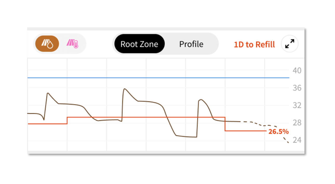 Soil data is super important for making smart and quick irrigation decisions. Our Plant-Dynamic refill line algorithm constantly calibrates plant and climate data to find the soil moisture level below which plant stress is likely to occur. It updates during the season in response to changing field conditions and plant phenological stage. In short, growers should irrigate to stay above this line. This feature includes: