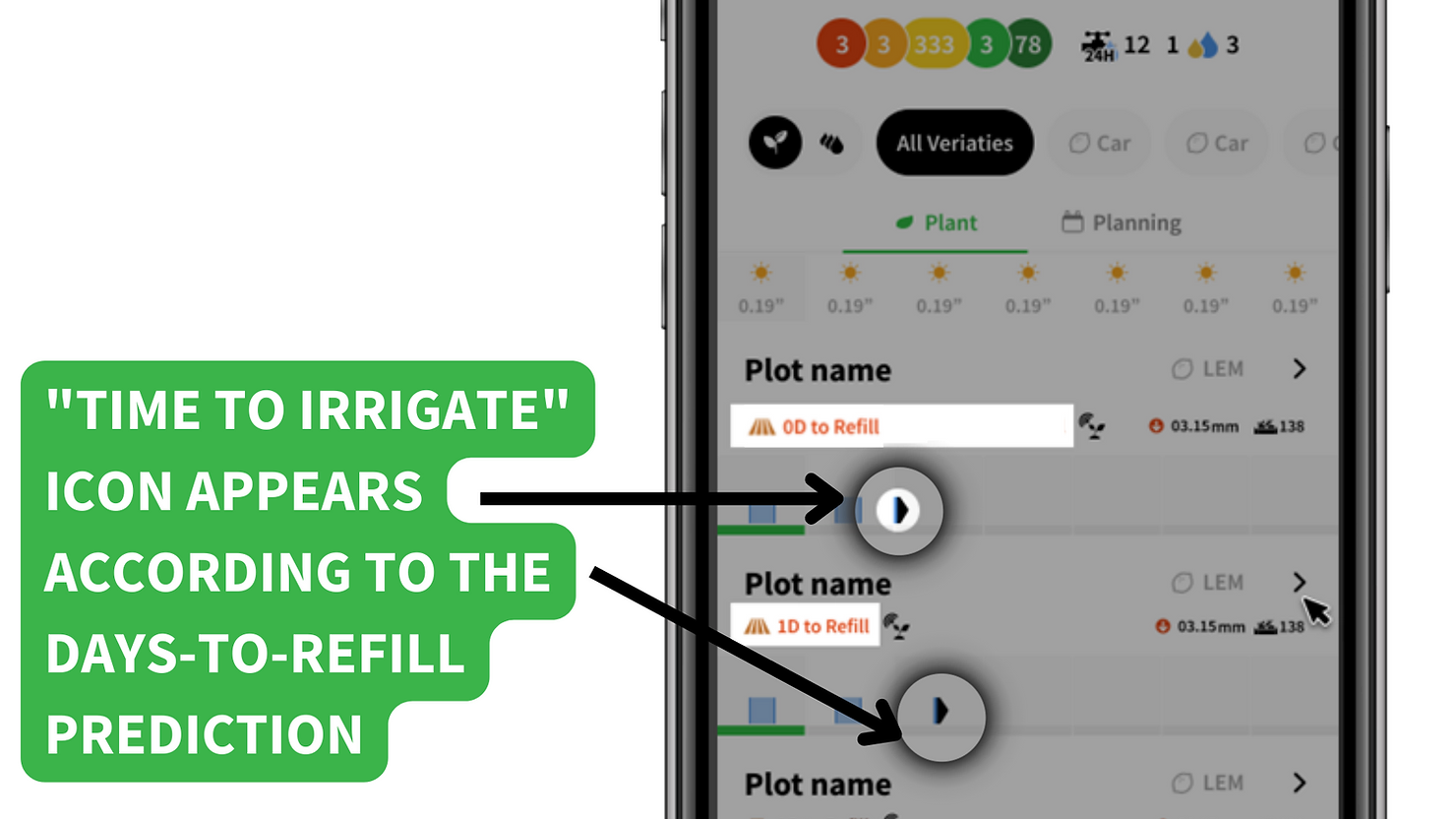 - “Days to refill” - the number of days until critically low soil moisture is expected, without irrigation or rain.
