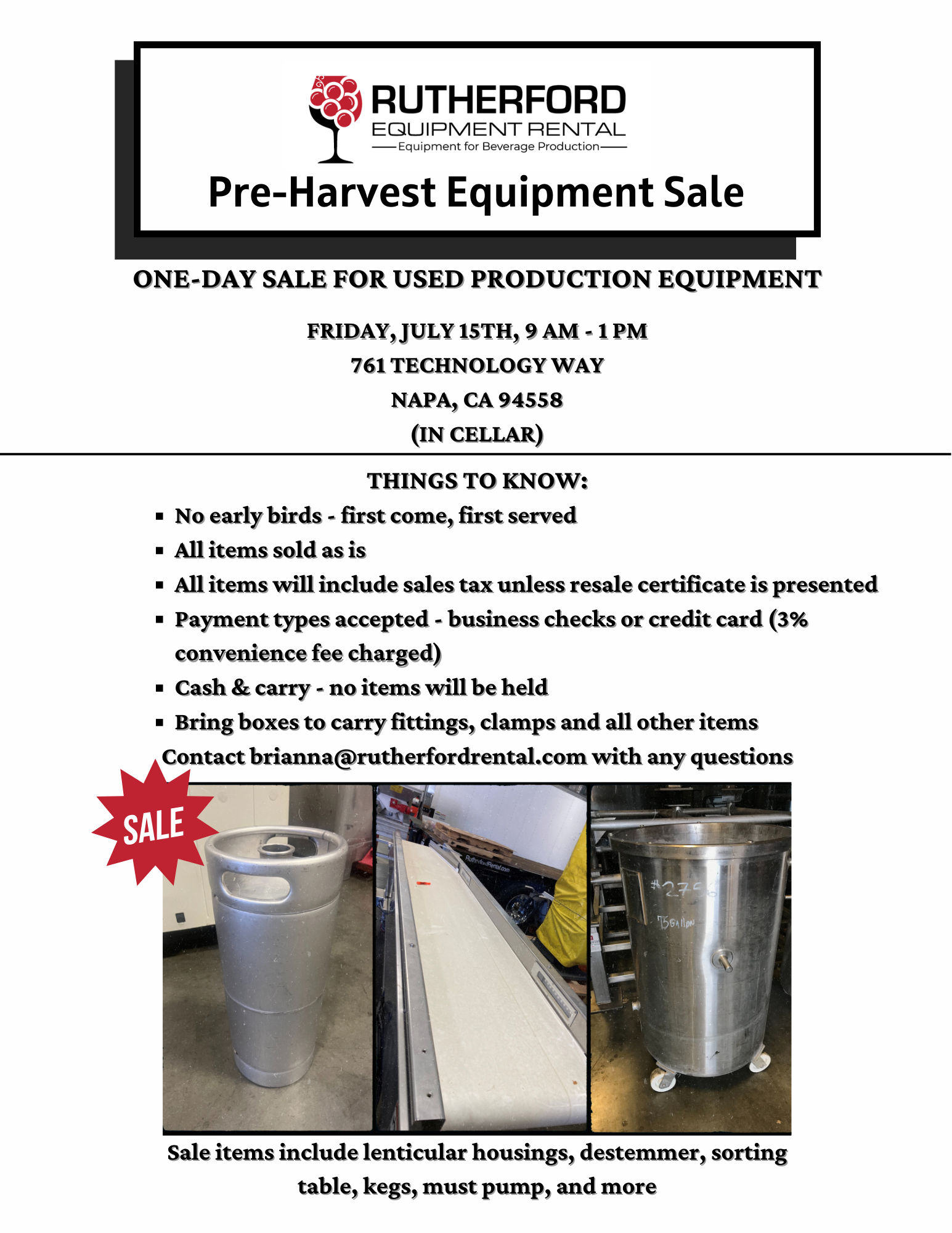 Items ranging from tanks, crushers, sorting tables, pumps, and misc cellar supplies are available. For a full list of sale items, contact brianna@rutherfordrental.com. Items are sold on a first-come, first-served basis.