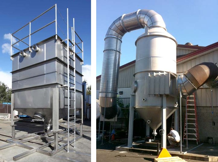 One of our partners for oaking systems carefully chars oak to light, medium or dark toasts. The wood smoke must be scrubbed before release into the atmosphere. The Cyclonic Separator pulls in the smoke, whirling it at high speed as it sprays water to wet the tiny burned wood particles which become heavy enough to precipitate out. The liquid is drained and filtered for safe disposal.